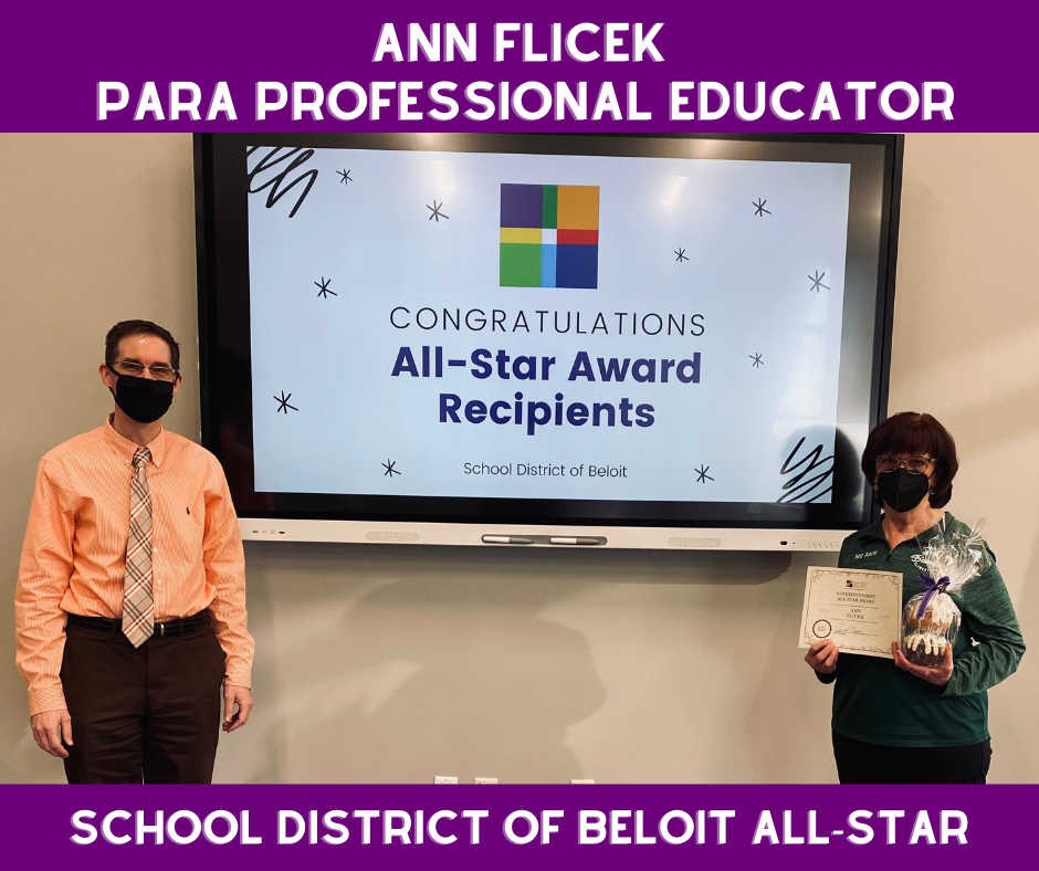 Betsy Schroeder debería ser reconocida como All-Star. Ella es dedicada y realmente se enorgullece del trabajo que hace por los demás. Siempre mantiene una actitud positiva y está dispuesta a ayudar con cualquier actividad o proyecto de clase. Ella va más allá todos los días por el personal, los estudiantes y sus familias. Somos muy afortunados de tener a Betsy en Beloit Learning Academy y Beloit Virtual School. Ella es una líder compasiva y apasionada no solo en nuestro edificio sino también en el Distrito. ¡Celebremos a nuestra All-Star favorita!