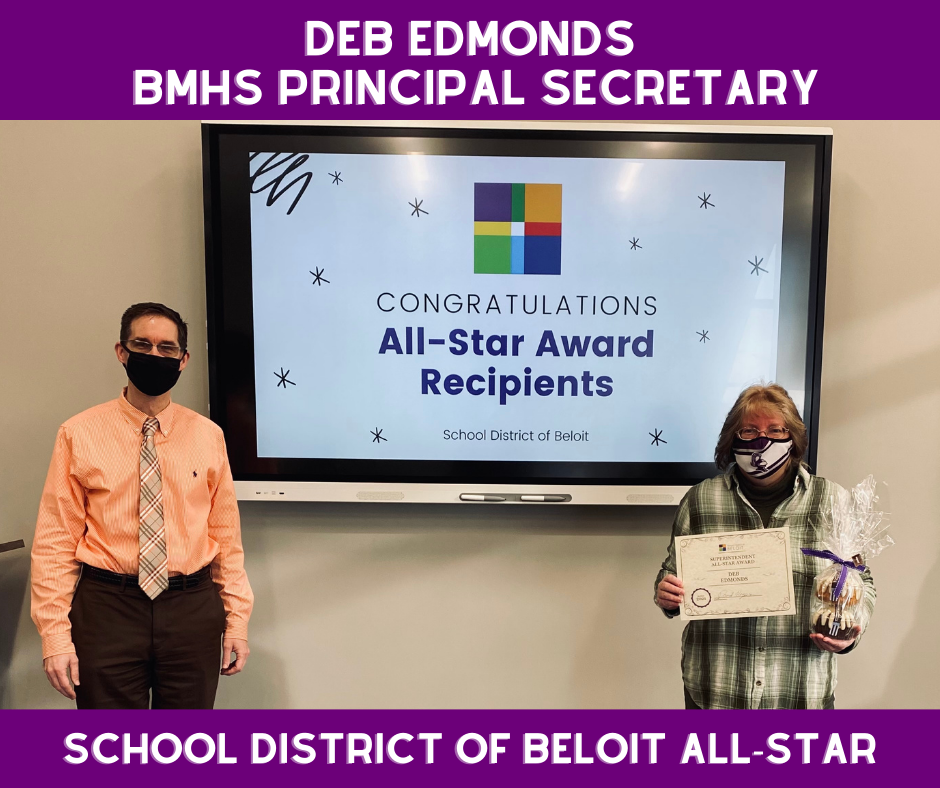 Deb Edmonds is a true All-Star. She goes above and beyond to keep our families, students, and staff up-to-date on everything that is going on at Beloit Memorial High School. She puts together the BMHS "Knight News" Newsletter that reaches hundreds of students and families every week. Deb is always willing to take phone calls and help others with any questions they have. She takes pride in the work she does and you can tell she is truly committed to our students, families, and staff. We are extremely fortunate to have Deb at BMHS and in our District.