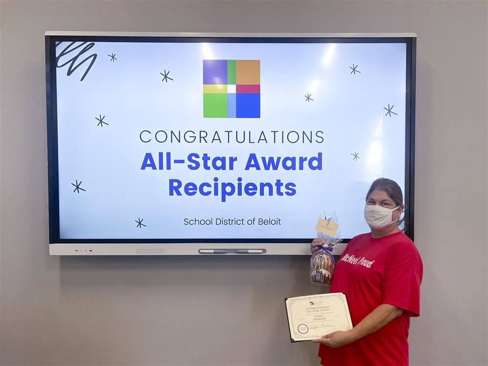 Betsy Schroeder should be recognized as an All-Star. She is dedicated and truly takes pride in the work she does for others. She always maintains a positive attitude and is willing to help with any activity or class projects. She goes above and beyond every day for the staff, students, and their families. We are so fortunate to have Betsy at Beloit Learning Academy and Beloit Virtual School. She is a compassionate and passionate leader not only in our building but in the District, as well. Here's to our favorite All-Star!