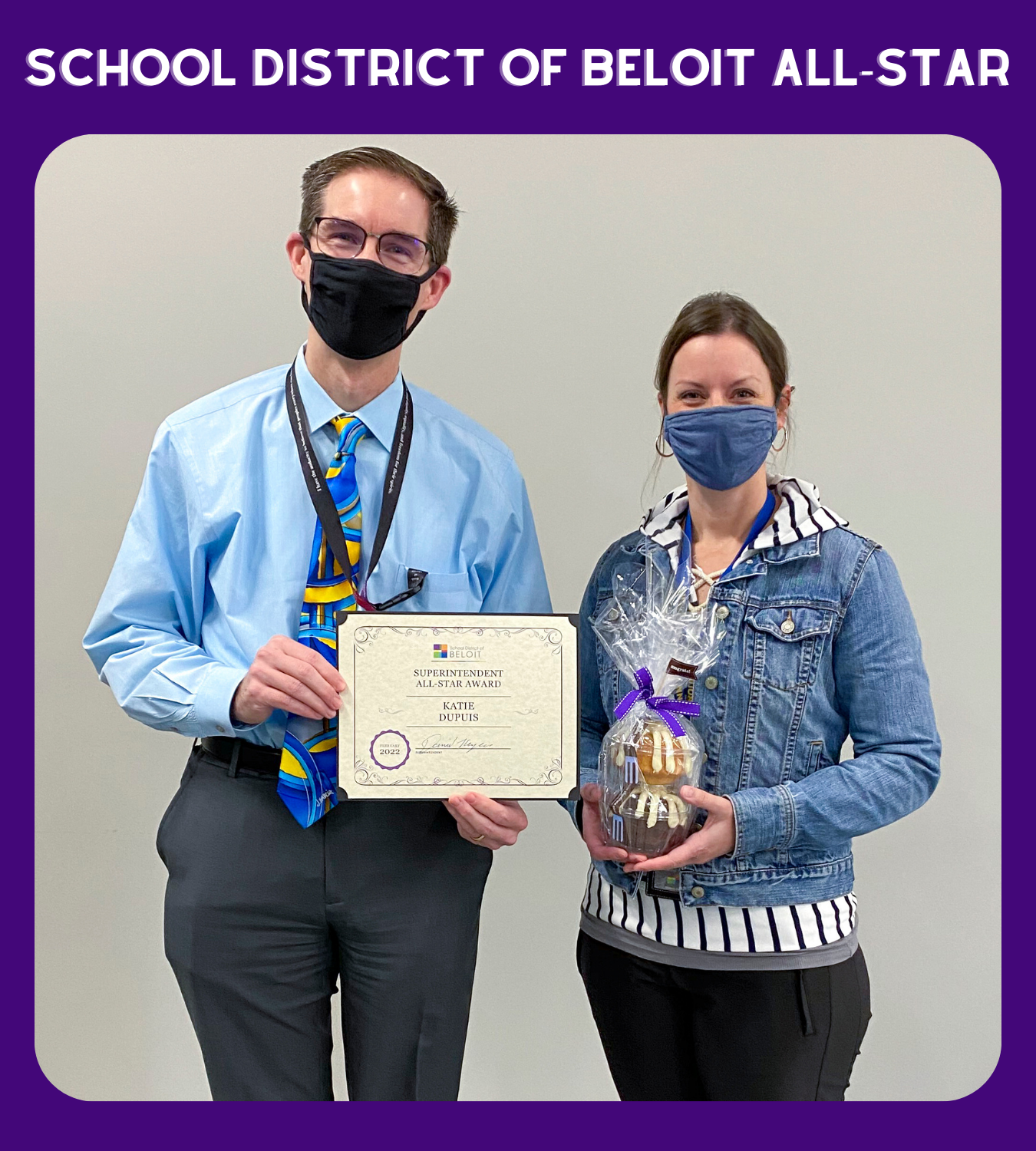 La Sra. Dupuis es una educadora sobresaliente tanto para sus estudiantes como para sus colegas. El año pasado, ayudo a tres compañeros NUEVOS al Distrito Escolar de Beloit y combinó un equipo fuerte con su inclusión y profesionalismo. Ella se acerca a los estudiantes con amabilidad, altos estándares y creando relaciones duraderas. Los estudiantes la buscan por muchas razones. Recomiendo que la Sra. Dupuis sea honrada porque es una verdadera ALL-STAR.
